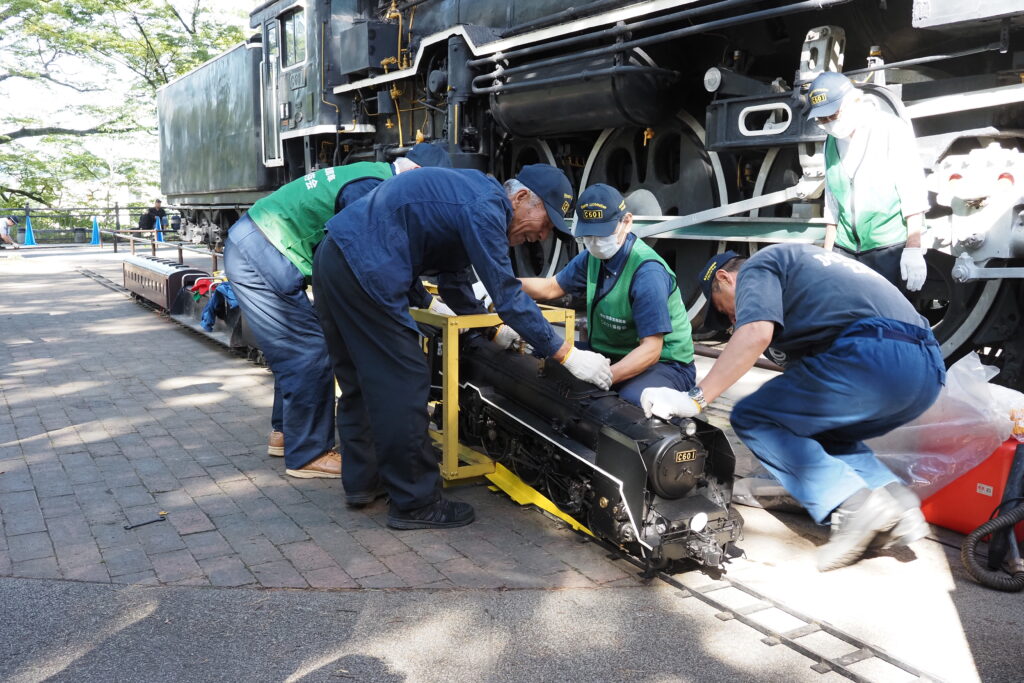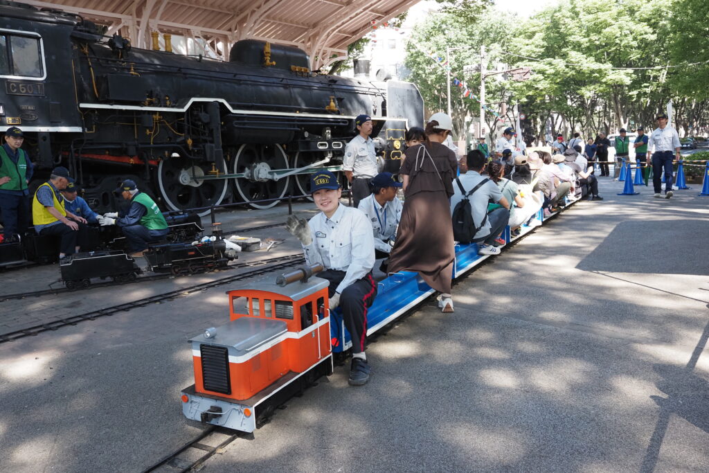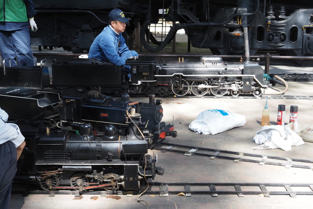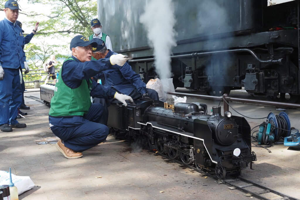 ミニSL運行はJR貨物東北支社様との共催で、車両やレールの提供を受けてC601の周りを周回運転していただいたほか、首都圏の同好団体「浪漫鐡道クラブ」がミニSL・C601をはるばる持ち込まれ、C601の横でデモ運転を行いました。
